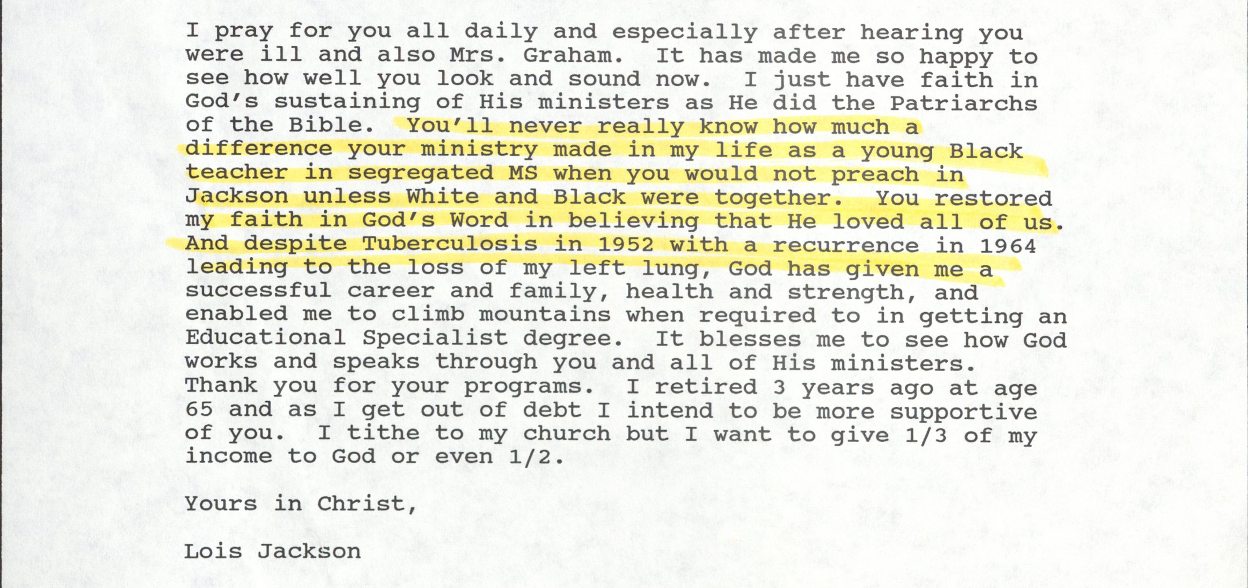 Even years later, people who had attended the Crusade wrote to Billy Graham of the impact it had on their lives. Notably, a woman by the name of Lois Jackson wrote to Rev. Graham in 1994 with the following words: