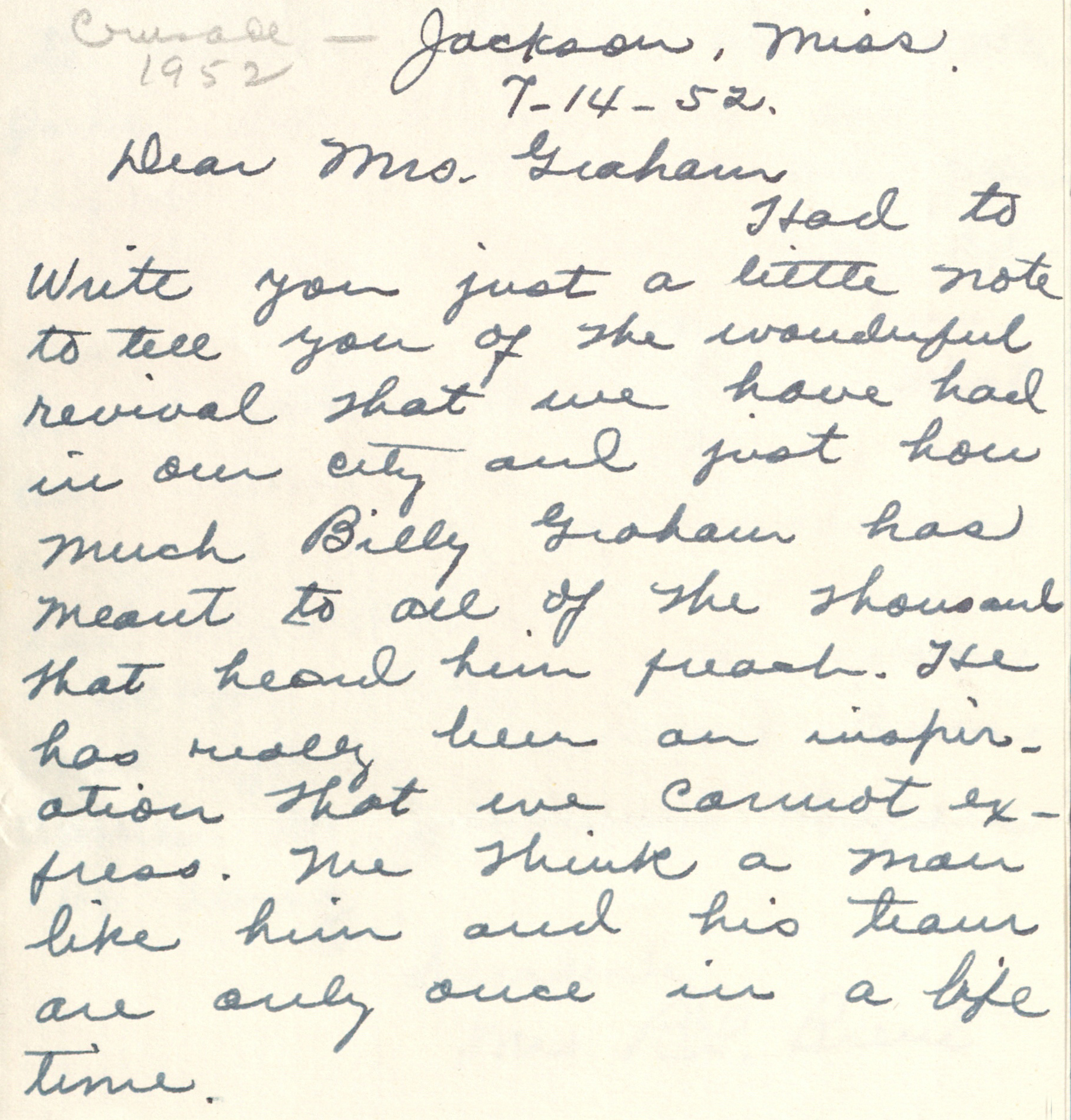 “Had to write you just a little note to tell you of the wonderful revival that we have had in our city and just how much Billy Graham has meant to all of the thousands that heard him preach. He has really been an inspiration that we cannot express. We think a man like him and his team are only once in a life time.”