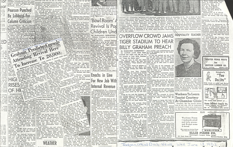 The newspapers across Mississippi wrote daily about what was happening at the nearly month-long Billy Graham Crusade in Jackson. Attendance at Tiger Stadium presented some of the biggest crowds Billy Graham had seen at that point in his ministry. He even wrote to his parents in June 1952 telling them, “We are having wonderful meetings here in Jackson. The first week is the largest week that we have ever had.”