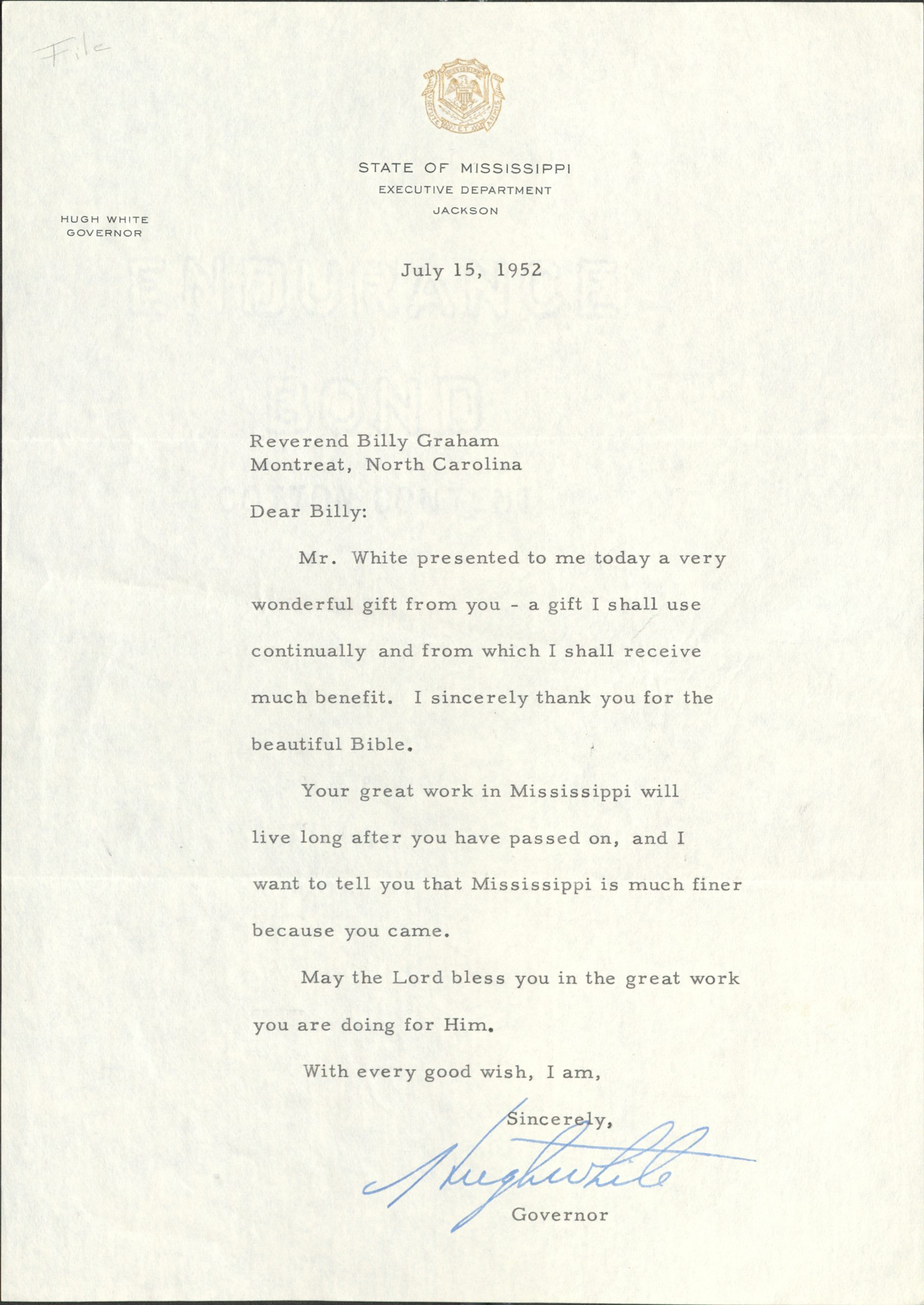 Even the highest-ranking official in the state of Mississippi wrote to Billy Graham about the impact he recognized had occurred in his home state. On July 15, 1952, Governor Hugh White wrote: