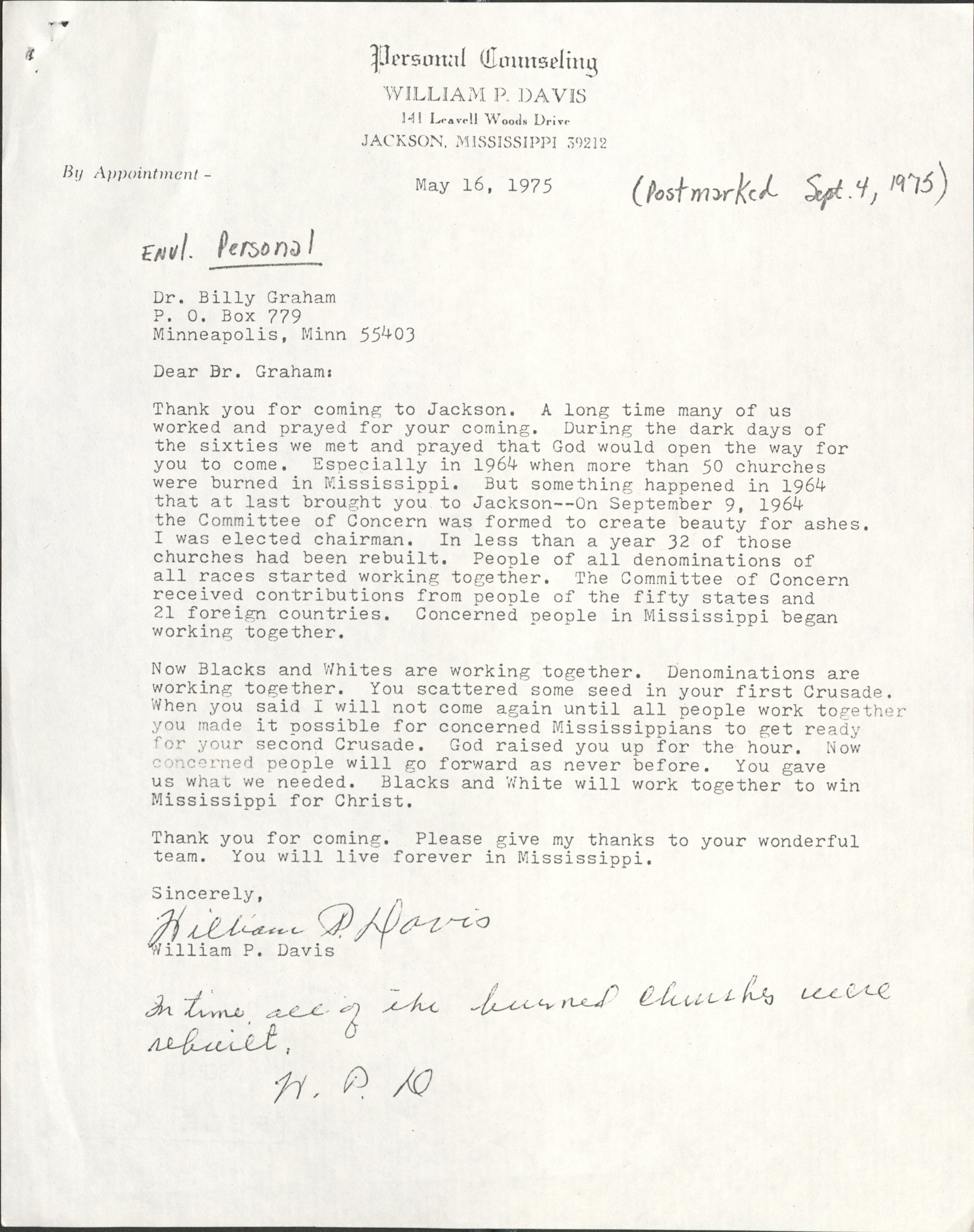 It is clear that God worked through his servant Billy Graham to touch the hearts of thousands across the state of Mississippi in 1952 and in 1975. Those efforts are probably best summed up in a letter to Rev. Graham from William P. Davis, a personal counselor in Jackson. In a letter dated May 16, 1975, he writes,
