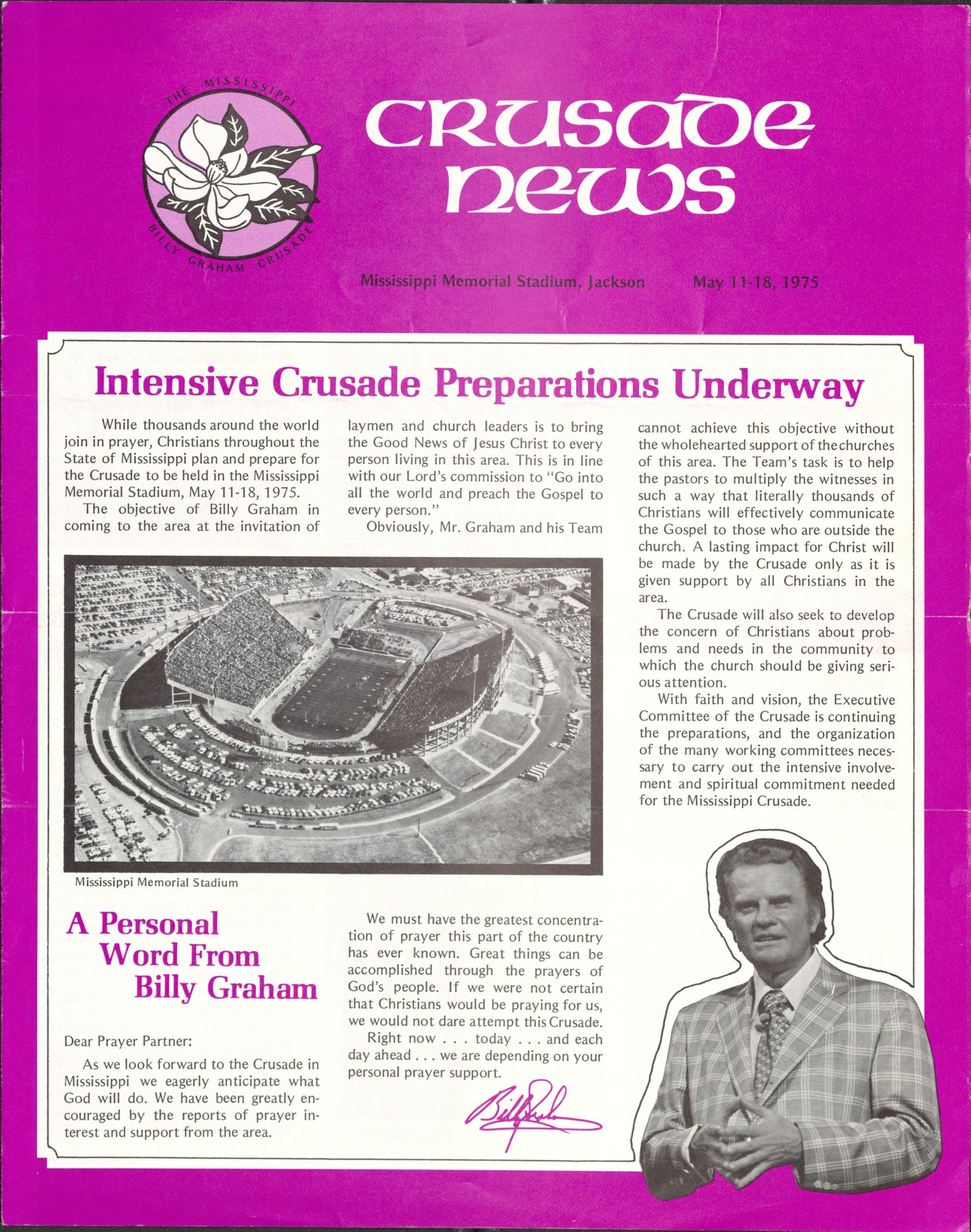 Years passed, but Billy Graham did not forget about the need to continue to share the Gospel in Mississippi. In May 1975, he returned to the Magnolia State. It was clear much thought and prayer were going into the preparations. In a Crusade newsletter prior to the Crusade, Billy Graham made an appeal to his readers about particular prayers for the event in Jackson: